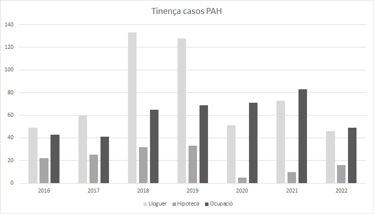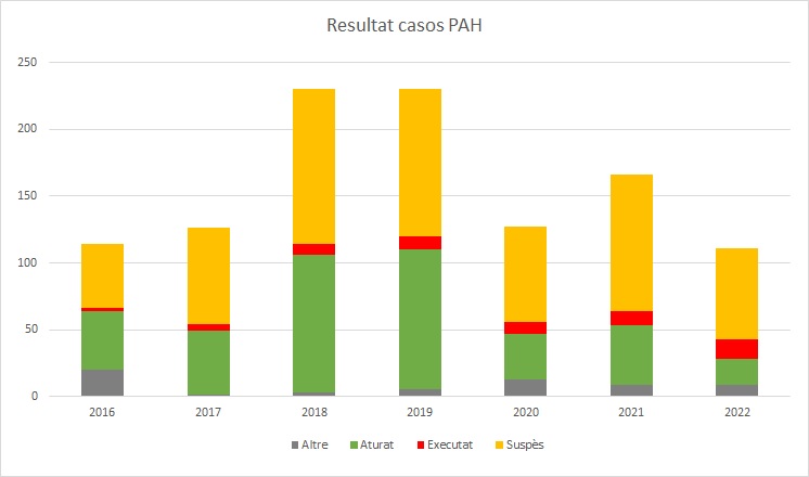 Les dades recollides per la PAH Barcelona són les més completes i les que més informació proporcionen per l'anàlisi. Observem com el nombre anual de casos amb desnonament es duplica entre 2016 i 2019 i després cau significativament l'any 2020, presumiblement per l'efecte de les moratòries imposades pel context pandèmic i de la Llei 24/2015. Malgrat les mesures, però, el nombre de casos no difereix gaire dels anys 2016 i 2017. L'efecte de les mesures també es pot observar en l'increment del percentatge de desnonaments suspesos als jutjats. El percentatge relatiu de desnonaments executats, però, sí que augmenta els anys 2020, 2021 i 2022, fet que indica que els casos no protegits per les moratòries han resultat més difícils d'aturar.