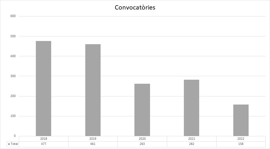 Les dades proporcionades pel canal de Telegram Desnonaments BCN ens permeten traçar l'evolució temporal i la distribució territorial de les convocatòries per aturar desnonaments a porta entre 2018 i 2022. Pel que fa a la seva evolució temporal, durant els anys 2018 i 2019 se'n van realitzar, de mitjana, gairebé dues convocatòries per dia laborable. A partir de 2020, s'observa una reducció significativa de les convocatòries, probablement per l'efecte de les moratòries imposades pel context pandèmic i les mesures de la Llei 24/2015. Així i tot, aproximadament, es va continuar fent una convocatòria per dia laborable durant els anys 2020 i 2021. El 2022, es va reduir la intensitat a 2 convocatòries cada 3 dies laborables. Aquestes dades demostren tant l'alt grau de mobilització dels col·lectius com la gravetat de l'emergència residencial a la ciutat.