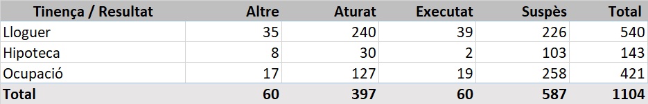 En proporció, els casos de desnonament que més s’executen són els de lloguer (7,2% dels de lloguer), en segon lloc els d’ocupació (4,5%) i per últim els d’hipoteca (1.4%). Els que més s’aturen a porta són els de lloguer (44,4%), després els d’ocupació (30,2%) i finalment els d’hipoteca (21%). Per últim, els casos de desnonament que més es suspenen als jutjats són, en proporció, els d’hipoteca (72%), després els d’ocupació (61,3%) i en darrer lloc els de lloguer (41,9%). A partir d'aquestes dades podem constatar l'alt grau d'efectivitat de l'organització col·lectiva, amb un percentatge de casos executats a porta relativament baix. D'altra banda, veiem com els casos de lloguer són els que més al límit es porten, ja que lideren tant les victòries com les derrotes a porta.